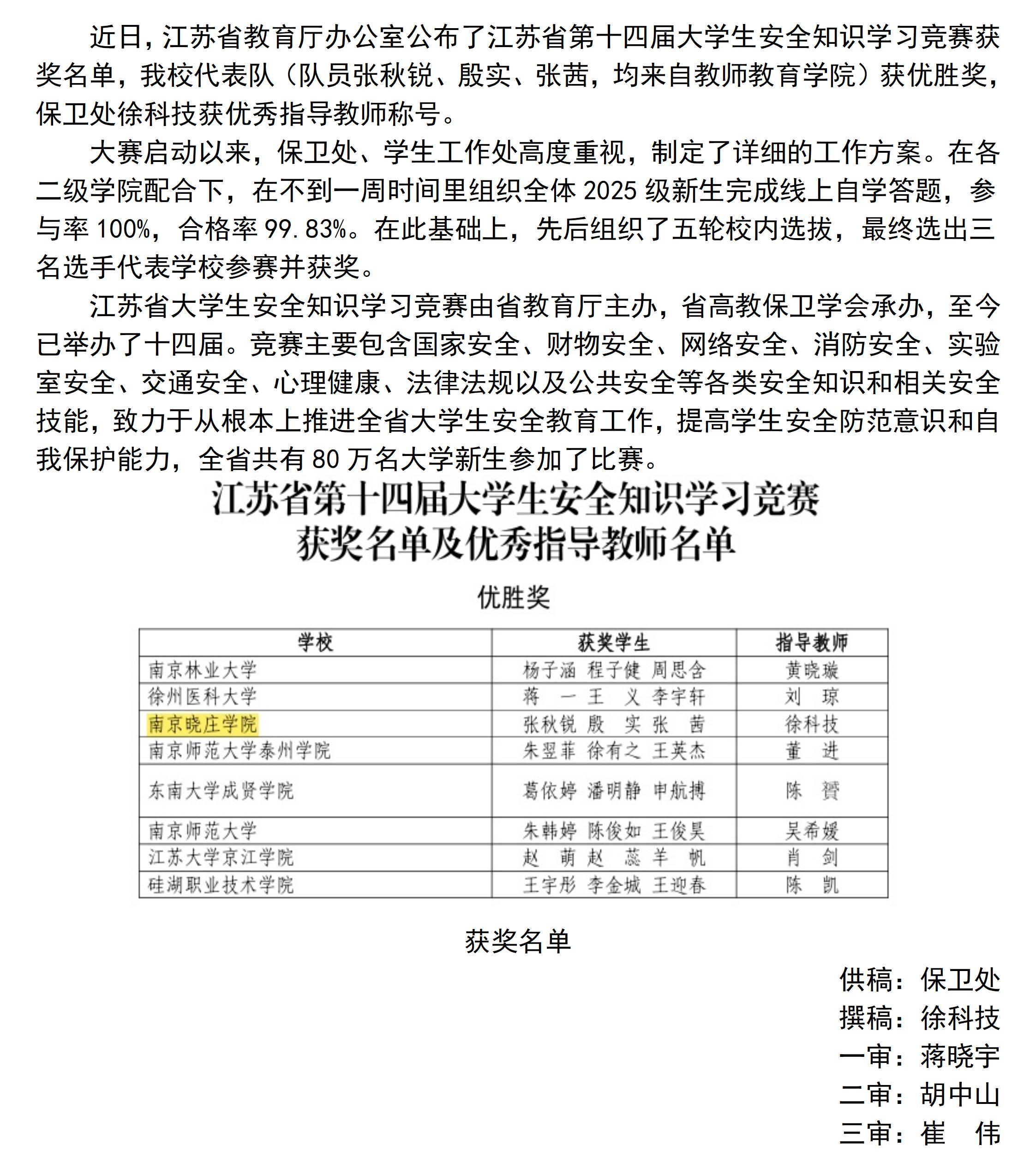 我校学生获江苏省第十四届大学生安全知识学习竞赛优胜奖