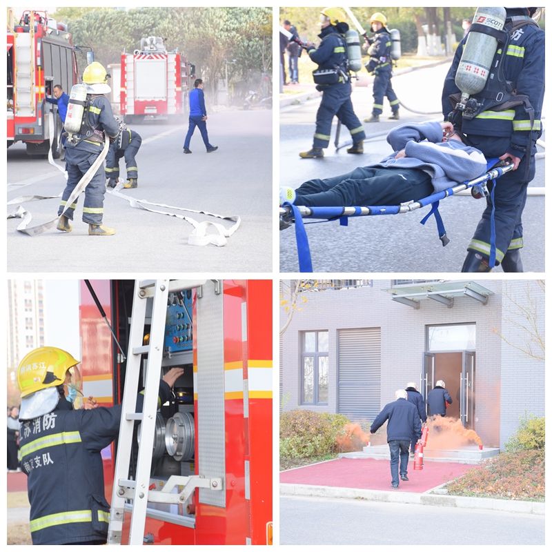 12时30分,随着副校长黄秀琴一声令下,演练活动正式开始。接到宿舍楼物业的消防“报警”后,消控室工作人员立即将火情报告保卫处并进行“119”报警。学校保卫处的安保人员在最短的时间内赶到“火灾现场”,对火情进行初步控制。同时,在现场工作人员的疏散引导下,楼内师生纷纷弯腰低身,捂住口鼻,有序地从各楼层安全通道迅速撤离。接到“火警”的江宁区消防中队的消防队员们驾驶消防车、携带消防救援装备赶到“火灾现场”。他们迅速制定灭火救援方案,用高射水枪组织立体水网,对火势进行交叉控制,还准备好云梯随时准备对楼内被困师生展开救援。消防队员们专业的消防技能和无畏的战斗气魄,赢得了在场师生们的阵阵掌声。救援队员还成功地将“受伤”同学从火场救出,送到已经等候在紧急救援点的校医院医生处进行施救。13时许,整个演练顺利结束。